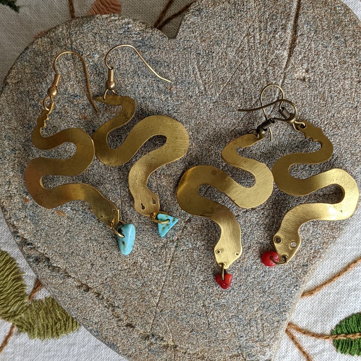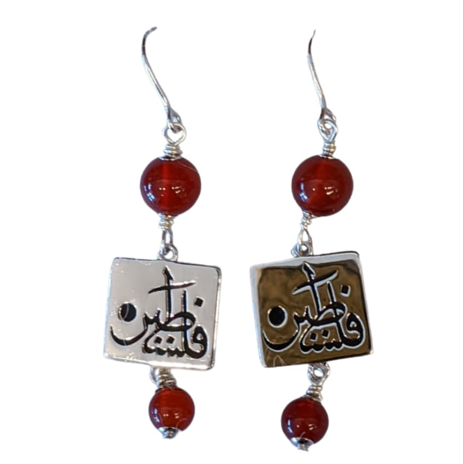 Express your solidarity! In Arabic, Palestine is spelled "Falastin". We placed a custom order with Katie Miranda for her Arabic calligraphy earrings using 5 different semi-precious stones: carnelian, malachite, onyx, pearl, and turquoise. These rhodium plated sterling silver earrings weigh 4.4 grams each and measure 2.3 inches from top of hook.