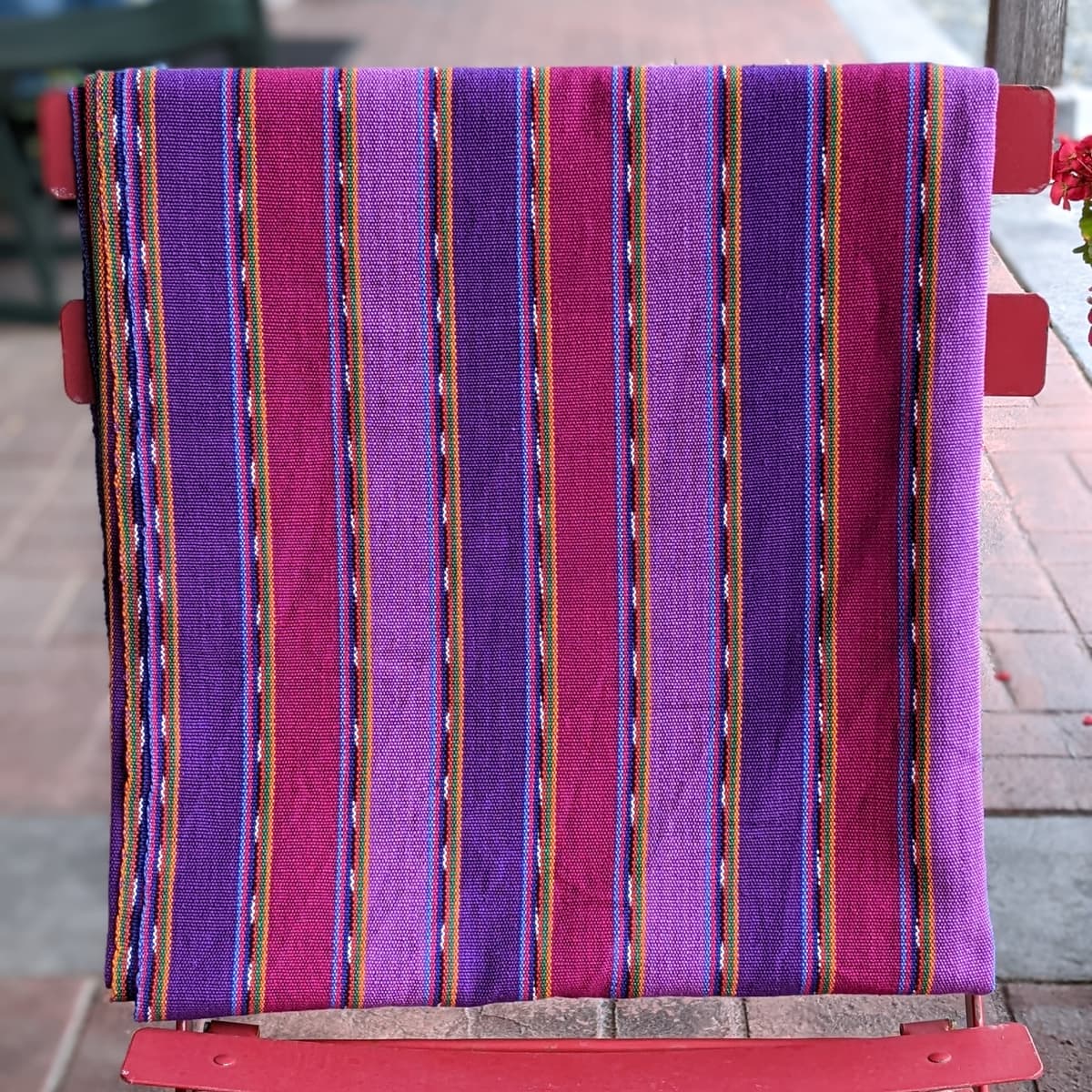 Elevate your dining experience with our vibrant Guatemalan Tablecloth in Red Stripe. Handwoven with authentic Guatemalan craftsmanship, this tablecloth adds a touch of elegance and cultural charm to any setting. Fits a 5 x 9 foot table. 100% cotton. Cold water wash, no bleach, line dry.